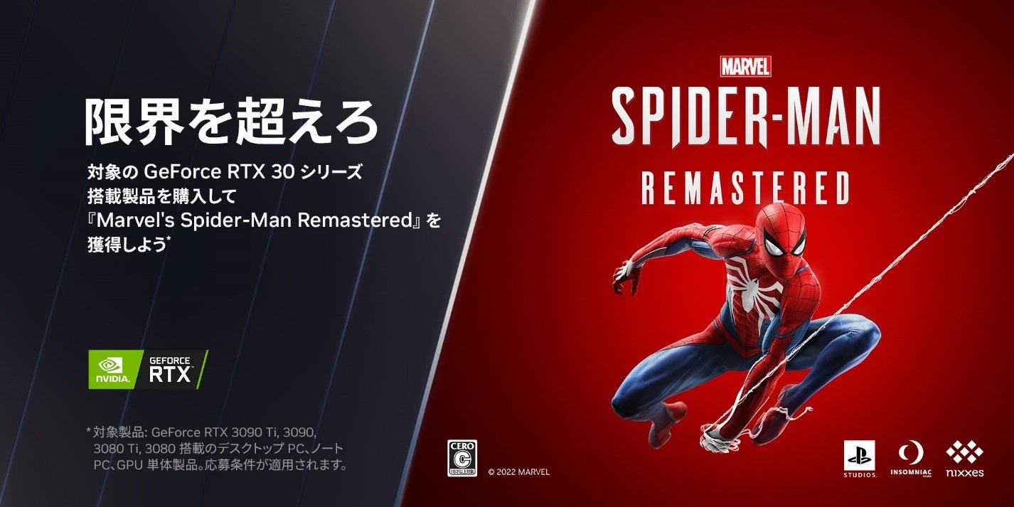 NVIDIA は本日、期間限定で、対象パートナー (https://www.nvidia.com/en-us/geforce/campaigns/pc-game-bundle-marvel-spider-man-remastered/ ) の GeForce RTX 3080、3080 Ti、3090、3090 Ti 搭載のデスクトップ、ノート PC、または GPU のいずれかを購入すると、『Marvel’s Spider-Man Remastered』 のデジタル ダウンロード版が獲得できる「Marvel’s Spider-Man Remastered GeForce RTX PC バンドル」の提供開始を発表しました。