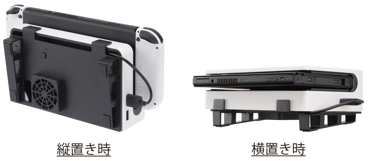Switchドックを熱から守る、横置きスタンド機能も付いた冷却ファンです。従来型のSwitchドックおよび有機ELモデル用Switchドックの両方に対応しています。