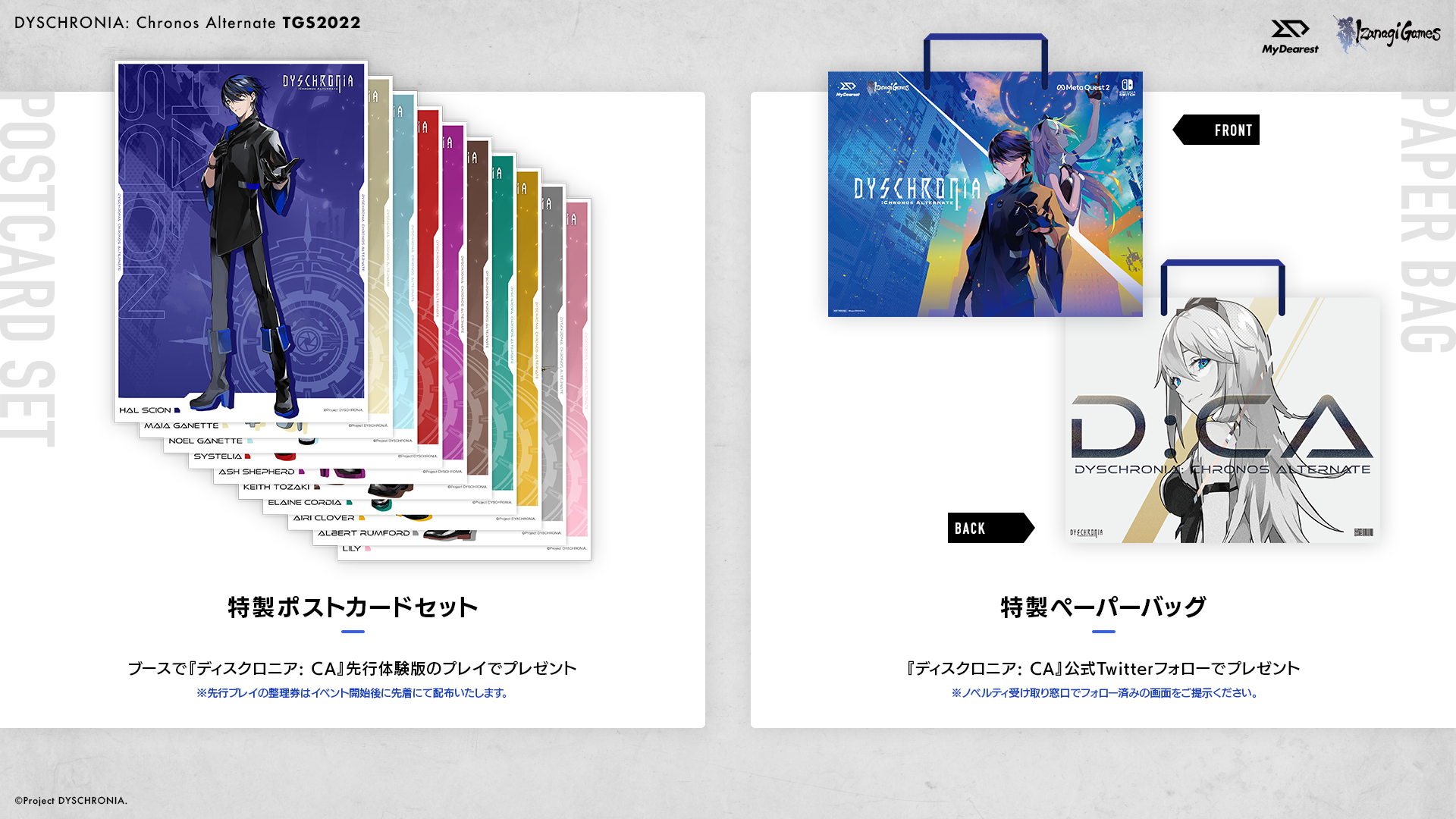 MyDearest/イザナギゲームズブースにて、『ディスクロニア: CA』公式Twitterアカウントのフォロー画面を見せてくれた方にもれなく「特製ペーパーバッグ」をプレゼントいたします。