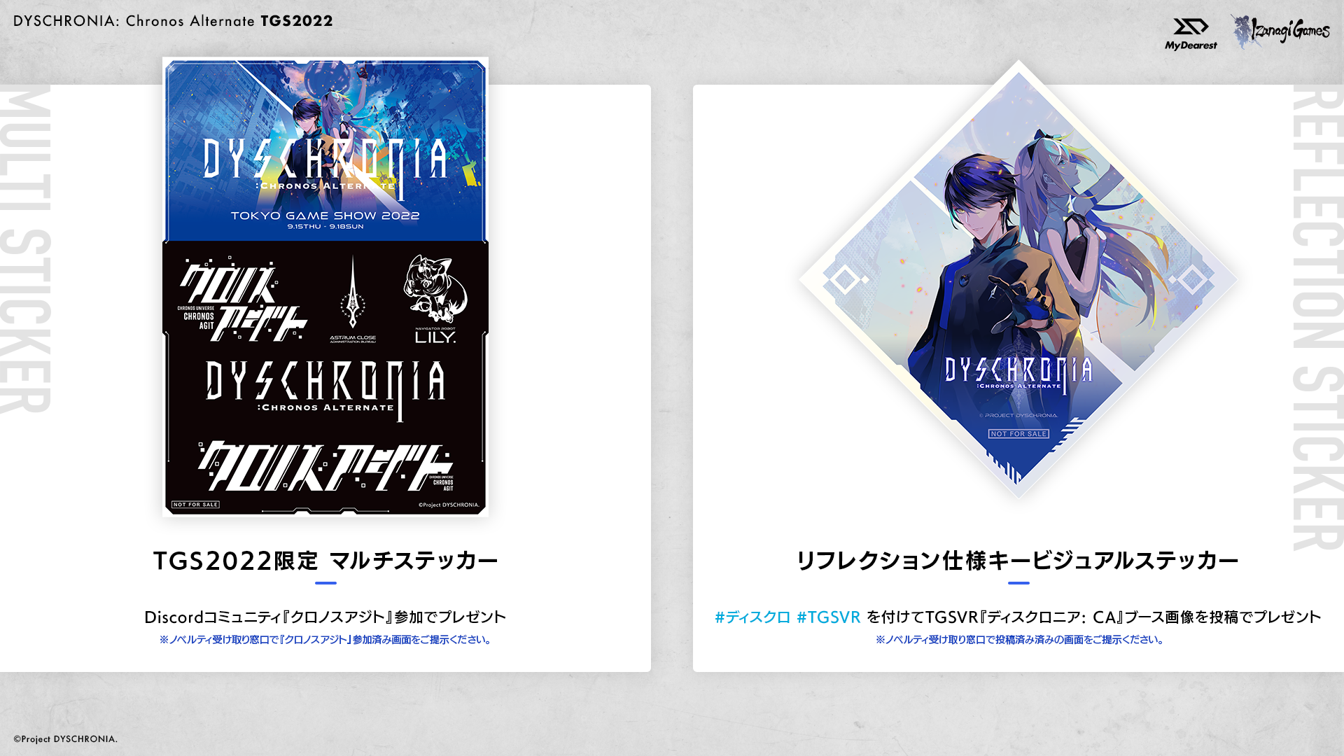 MyDearest/イザナギゲームズブースにて、「#ディスクロ #TGSVR 」のハッシュタグを付けたTGSVR『ディスクロニア: CA』ブースの投稿画面を見せてくれた方にもれなく「リフレクション仕様キービジュアルステッカー」をプレゼントいたします。
