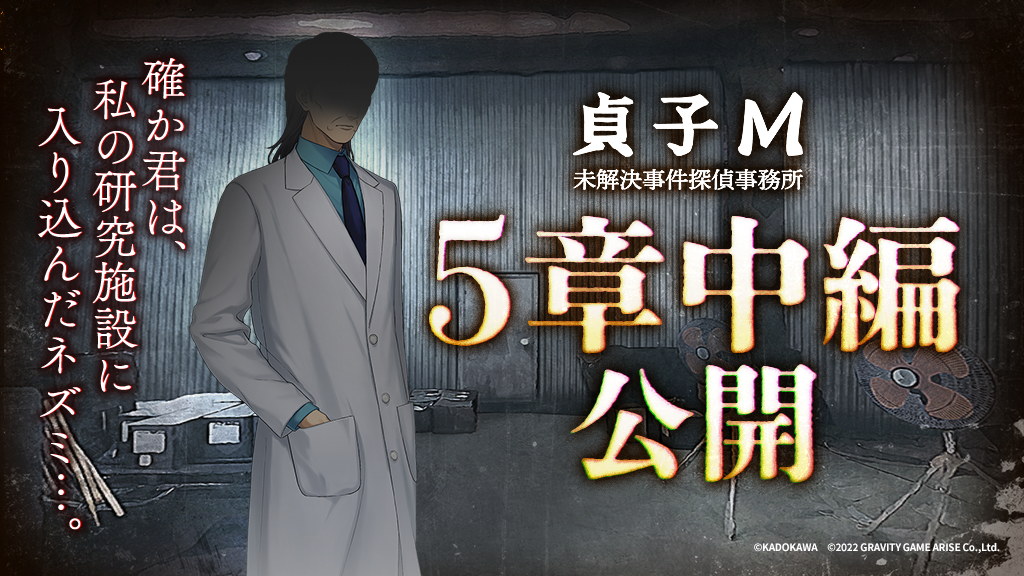 グラビティゲームアライズ株式会社(所在地:東京都中央区)は、スマートフォン・タブレット向け謎解きホラー脱出アドベンチャー『貞子M 未解決事件探偵事務所』において、本日2022年9月8日(木)より、最新エピソードとなる新章【5章『異能』中編 】を公開いたしました。