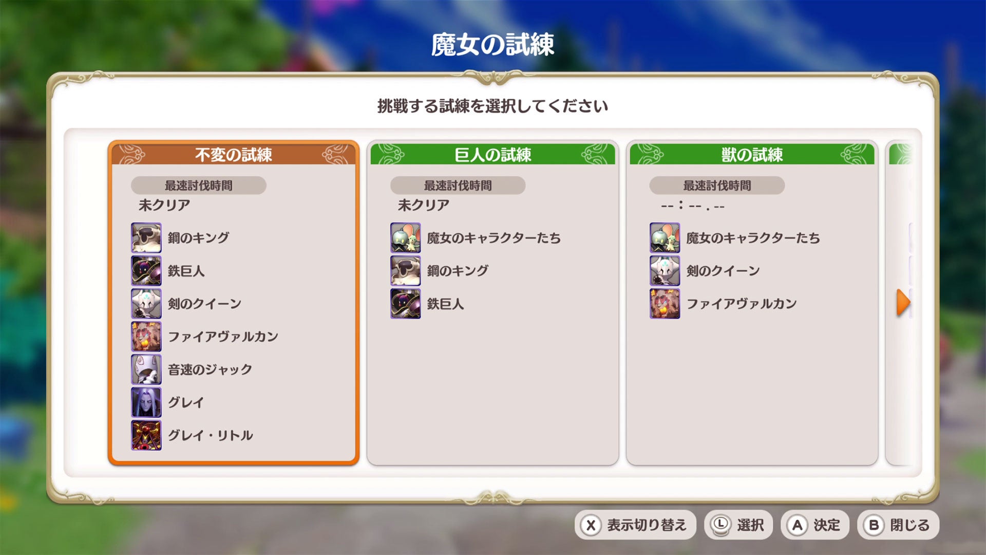 ゲームをクリアした後、強敵たちと連戦する「魔女の試練」が遊べるようになります。
