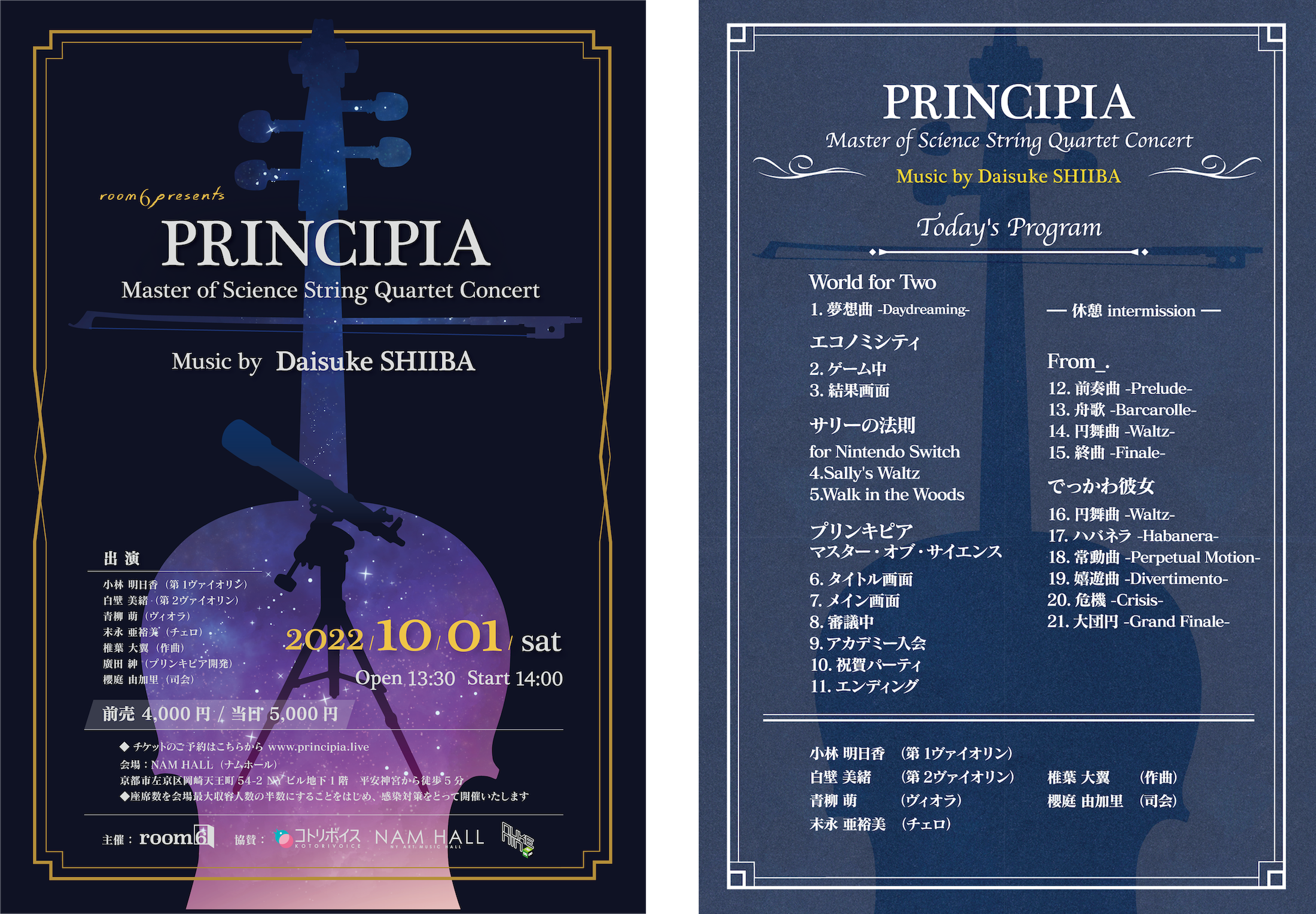 株式会社room6(本社:京都市左京区、代表取締役:木村征史)は、2022年10月1日に京都・NAM HALLにて開催する「PRINCIPIA: Master of Science String Quartet Concert -Music by Daisuke SHIIBA-」の演目全21点を公開したことをお知らせします。また演奏会とリリース6周年を記念して「プリンキピア:マスター・オブ・サイエンス」スマートフォン版の無料セールを実施します。