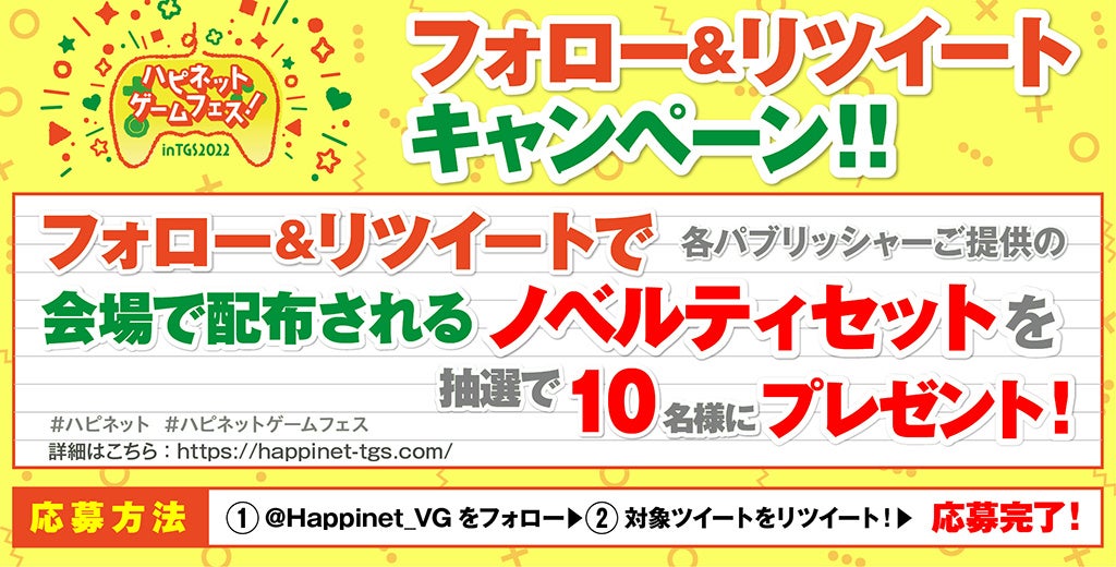 TGSの出展に伴い、ハピネットゲーム&GOODSのTwitter公式アカウントで、会場内ノベルティや本キャンペーン限定ノベルティが当たる、フォロー&リツイートキャンペーンを実施します。詳細は後日公開します。公式アカウントをフォローいただき、続報をお待ちください。