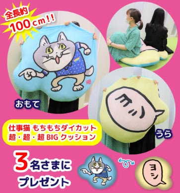 モーリーファンタジー公式Twitterをフォローし、指定ツイートをリツイートしていただいた方の中から抽選で3名さまに約100cmのビッグサイズ「仕事猫 もちもちダイカット超・超・超BIGクッション」をプレゼントいたします。詳細は公式Twitterをご確認ください。