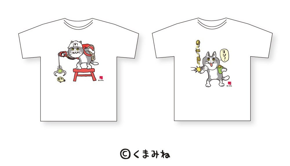 クレーンを操る仕事猫と、メダルで「ヨシ!」する仕事猫の全2種類。使いやすい白Tシャツなのもポイント。