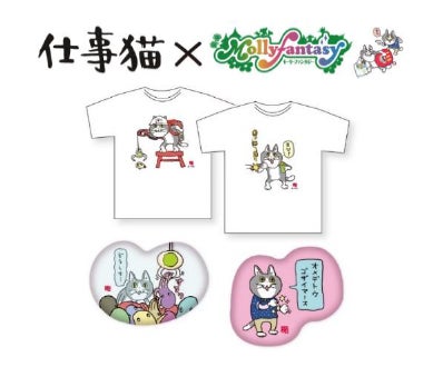 仕事猫 もちもちダイカットクッション 全2種、Tシャツ 全2種、ミニクッションストラップ 全5種、指差しアクリルキーホルダー 全6種、ホログラム缶バッジ 全15種