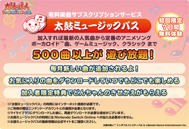 さらに、500曲以上が遊び放題になる有料楽曲サブスクリプションサービス「太鼓ミュージックパス」も登場!
