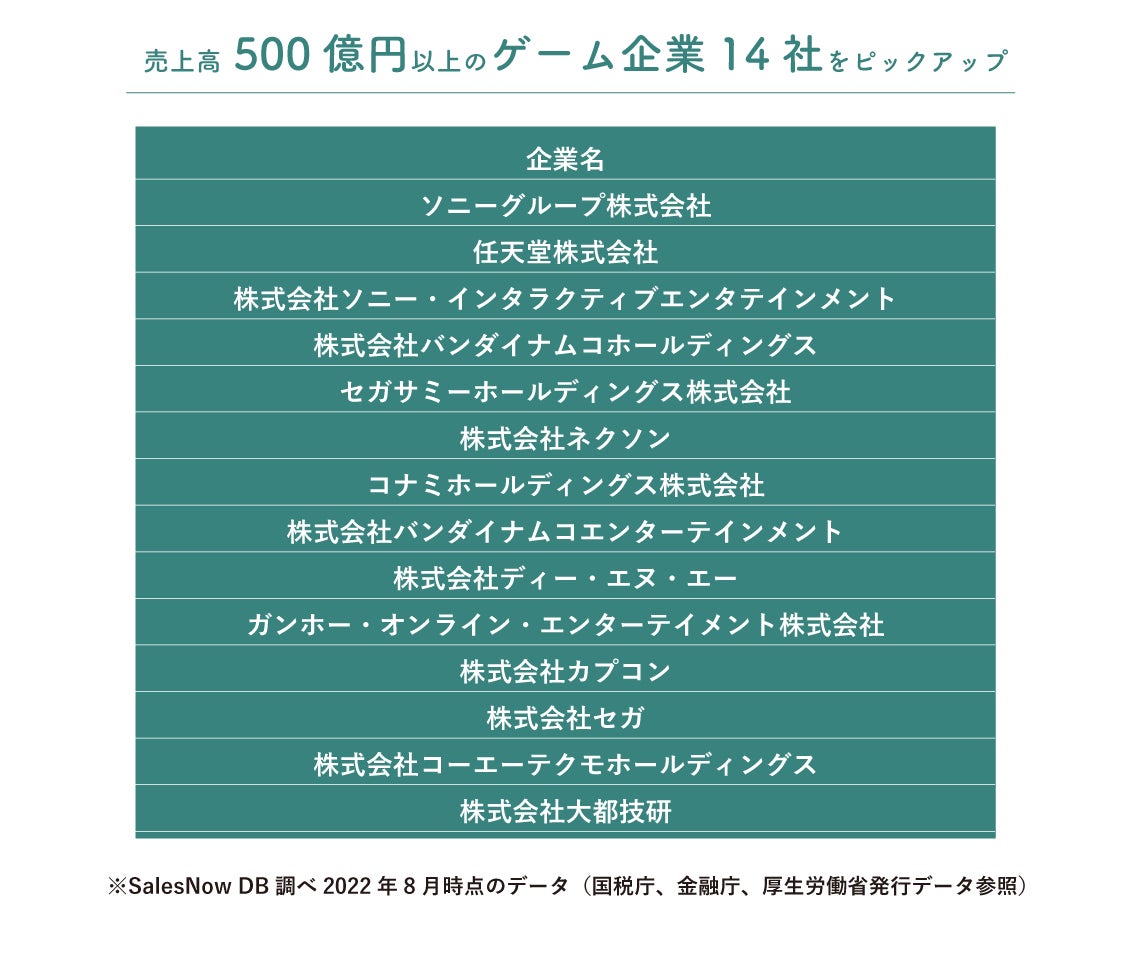 - 売上500億円以上のゲーム会社14社から一部企業をピックアップ