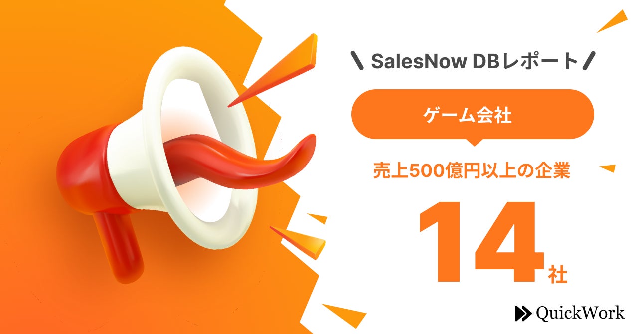 「データとテクノロジーで、ビジネスを加速させる。」をミッションに掲げ、日本全国約510万社の企業データを基盤に営業の効率化を支援する「SalesNow」を展開してきた株式会社QuickWork(本社:東京都渋谷区、代表取締役:村岡 功規、以下「QuickWork」)は、日本最大級のデータベース「SalesNow DB」のデータを活用した「SalesNow DBレポート」から、今回は「売上500億円以上のゲーム会社14社」をピックアップしました。