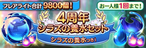 4周年記念のログインボーナスで、初日に蒼粒子2000個、2日目以降は聖錬素材・シラズの養水【SSR】等をプレゼント!