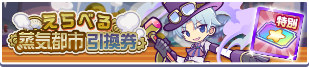 内容:「蒸気都市確定チケットガチャ」を開催します。対象の蒸気都市キャラクターの中から、いずれか1枚が必ず出現します。「報酬交換所」で交換可能な「蒸気都市確定チケット」で引くことができるガチャです!