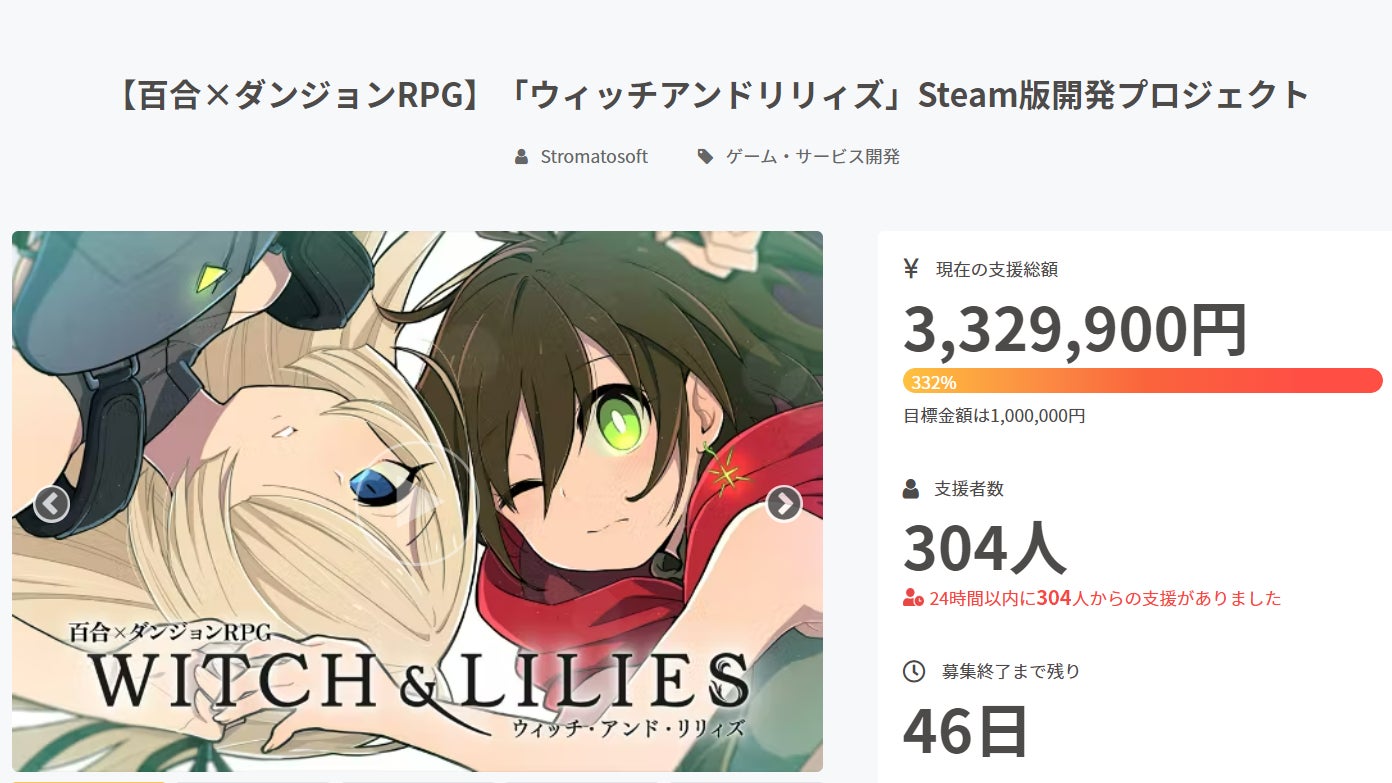 株式会社ストロマトソフトは「百合」をテーマとしたsteam向け新作ダンジョンRPG「ウィッチ・アンド・リリィズ」の開発資⾦調達を⽬指し、2022年9⽉14⽇(⽔)よりCAMPFIREにてクラウドファンディングを実施しておりましたが、開始から12時間で⽬標⾦額300%の⽀援を募ることに成功いたしました。今後ストレッチゴールの達成を⽬指し、さらなる豪華情報解禁をプロジェクト期間を通して継続的に⾏ってまいります。