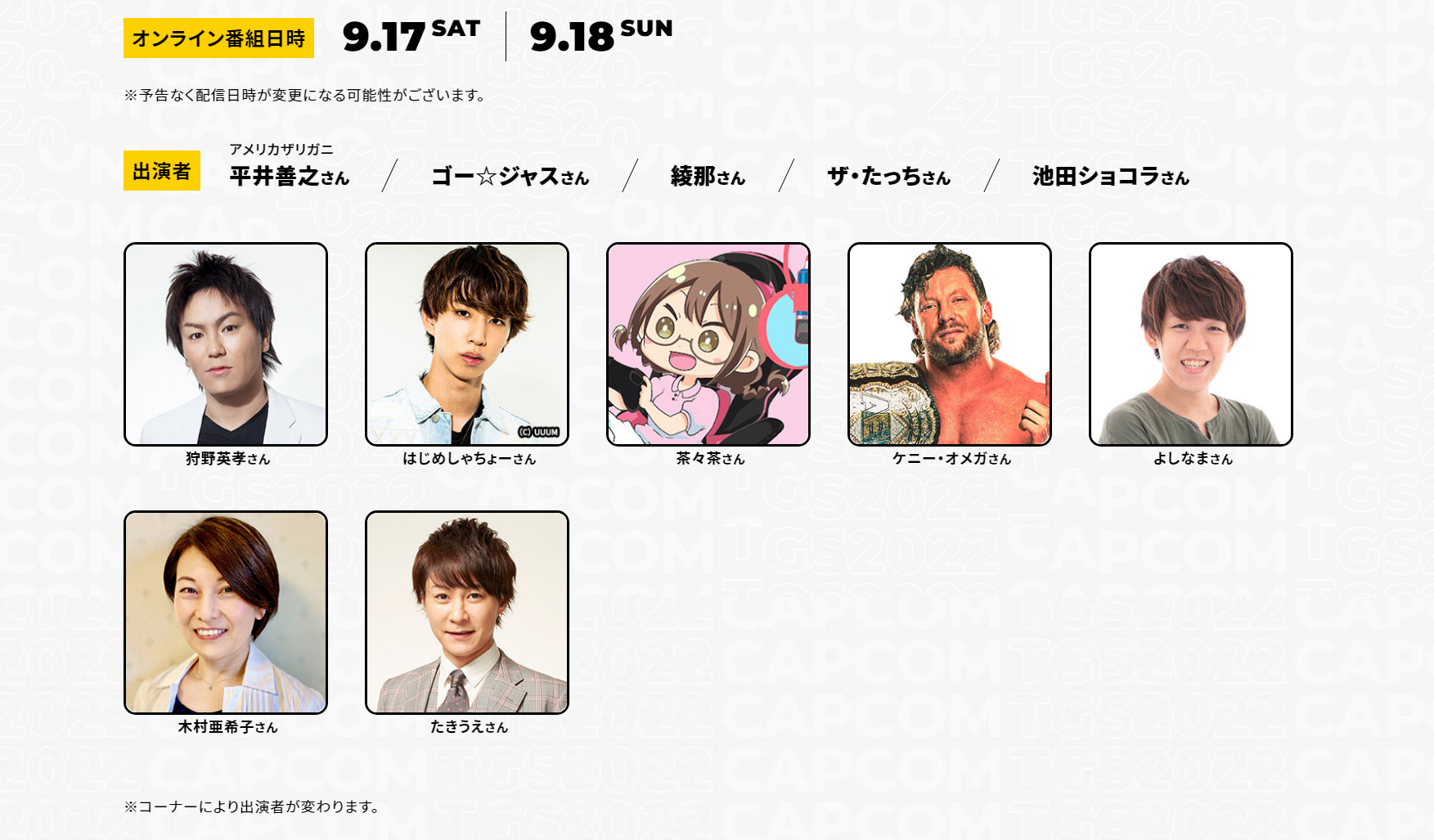 カプコン公式WEB番組「カプコンTV!」を東京ゲームショウ会場より2日連続で生配信! 番組レギュラー陣に加え、スペシャルゲストを多数お招きしてお届けする予定です。