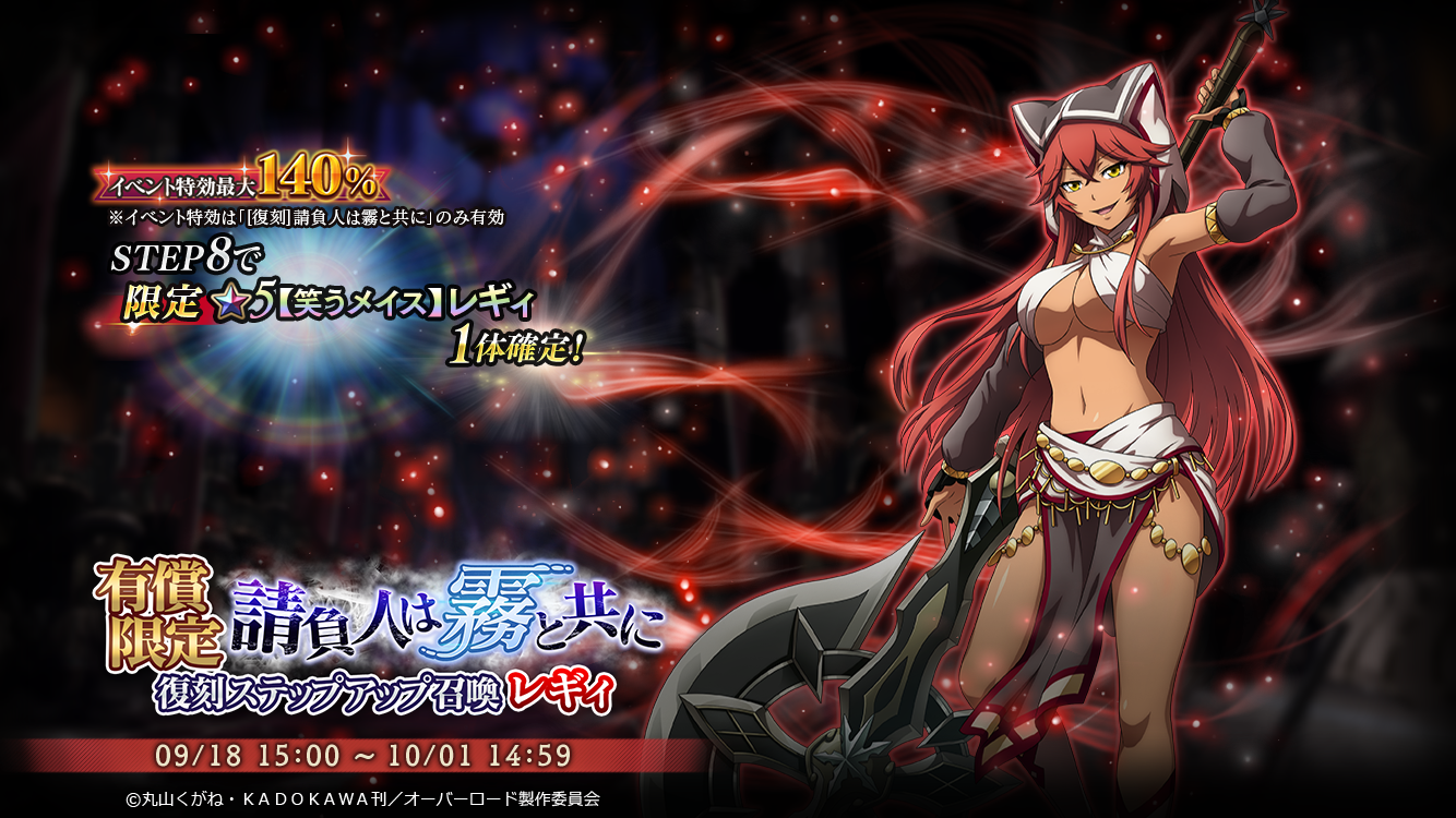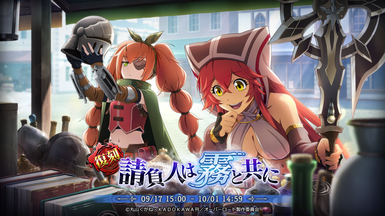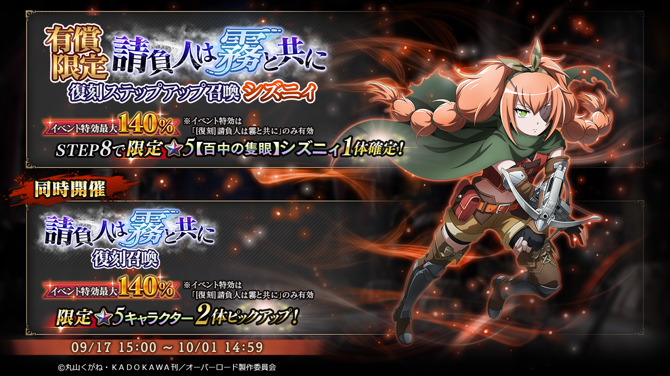 9/17よりイベント『[復刻]請負人は霧と共に』を開催いたします!イベント連動召喚では『★5【百中の隻眼】シズニィ』『★5【笑うメイス】レギィ』が復刻登場!さらに、TVアニメと連動した召喚の『TVアニメ オーバーロードⅣ 放送記念 混沌の遺物召喚 -Chapter11-』も好評開催中!