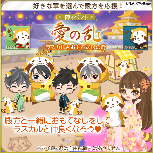 本企画は、戦国時代を舞台に、乱世を生き抜く武将や忍との“命懸けの恋”をお楽しみいただけるボル恋タイトル「天下統一恋の乱 Love Ballad ~華の章~」(以下、「恋乱LB~華の章~」) と、幅広い年代層に絶大な人気を誇るラスカルのコラボ企画になります。「皆でおもてなし♪ ラスカル日の本大横断!」と題して、期間中アプリ内でコラボストーリーやミッションなど様々な企画をご用意。この機会にしか手に入らない可愛い限定アイテムもありますので、「恋乱LB~華の章~」とラスカルのコラボを存分にお楽しみください。