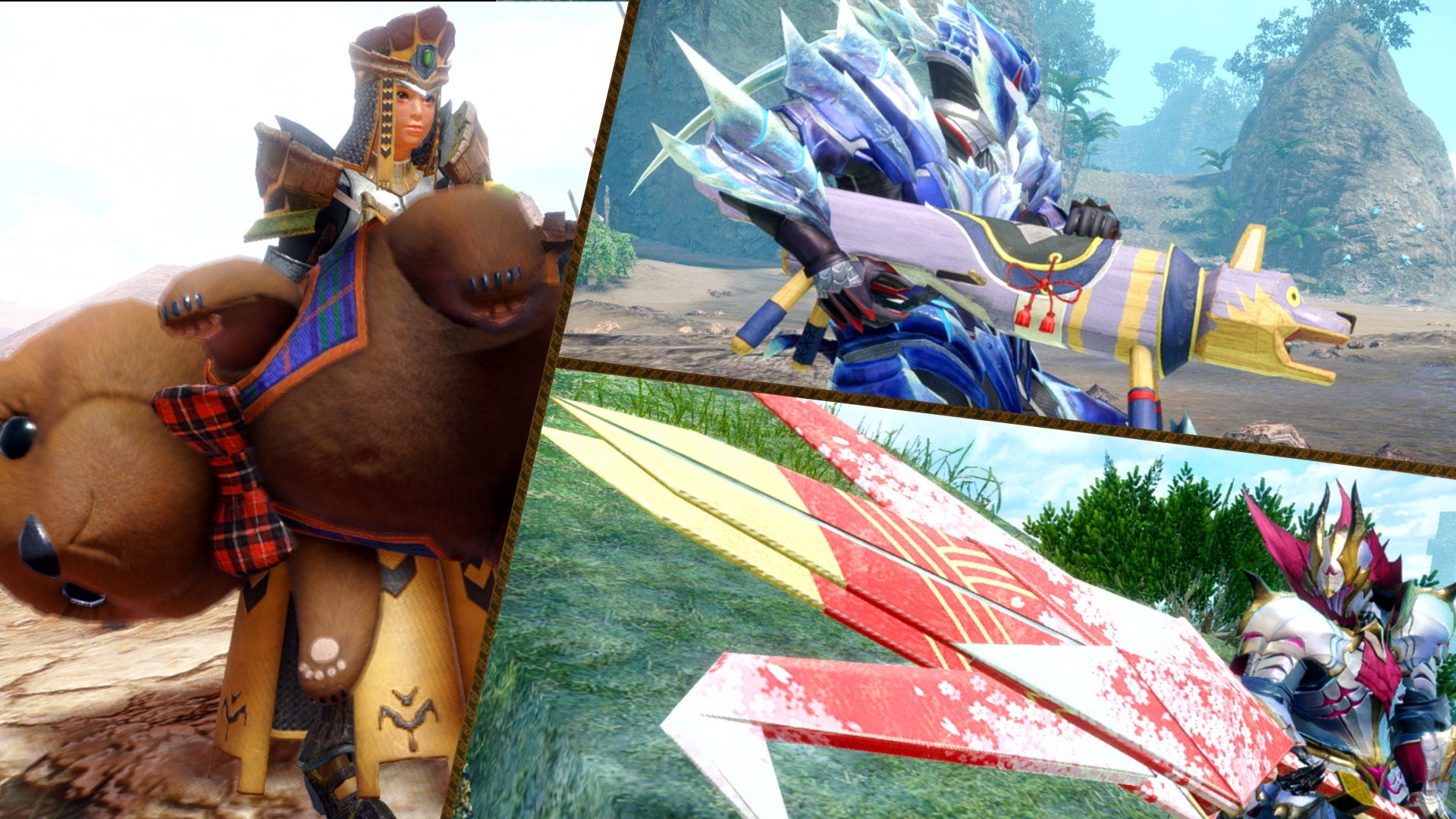 なりきり重ね着、重ね着武器、ハンター・オトモの重ね着、追加ジェスチャー、追加ポーズ、追加スタンプ、髪型など盛りだくさん!