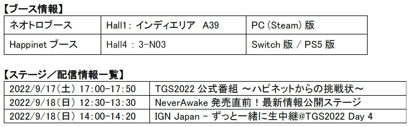 | 公式ページ | https://neverawake.neotro.jp/ |