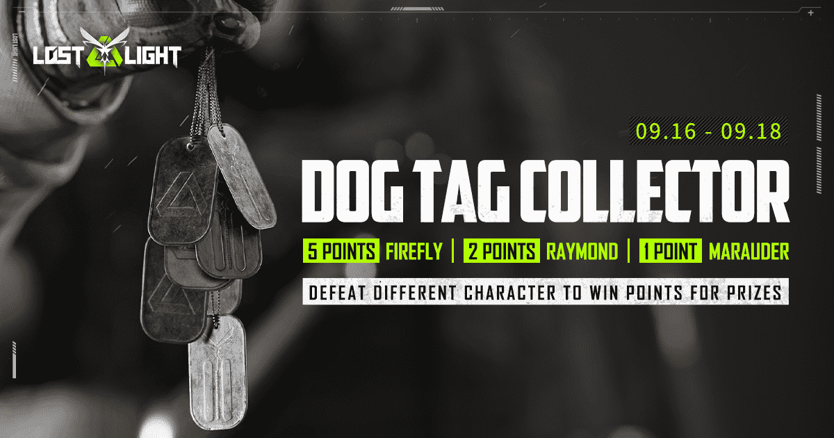 『Lost Light』第一回ドッグタグコレクターチャレンジマッチ開催。対戦で撃破ポイントを溜め、「上級会員カード」ゲットのチャンスを狙おう。イベント中にホタルを撃破すると5ポイント、レイモンドの一味を撃破すると2ポイント、マローダーを撃破すると1ポイント獲得できる。試合から持ち出したドッグタグは、1つにつき1ポイント追加で獲得できる。
