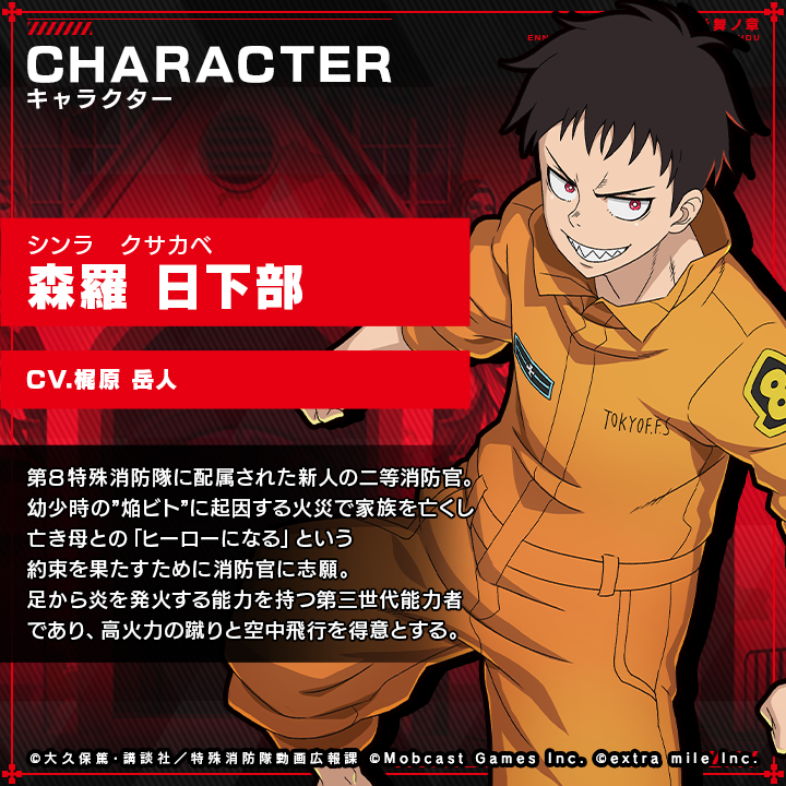 幼少時の“焔ビト”に起因する火災で家族を亡くし、亡き母との「ヒーローになる」という約束を果たすために消防官に志願。