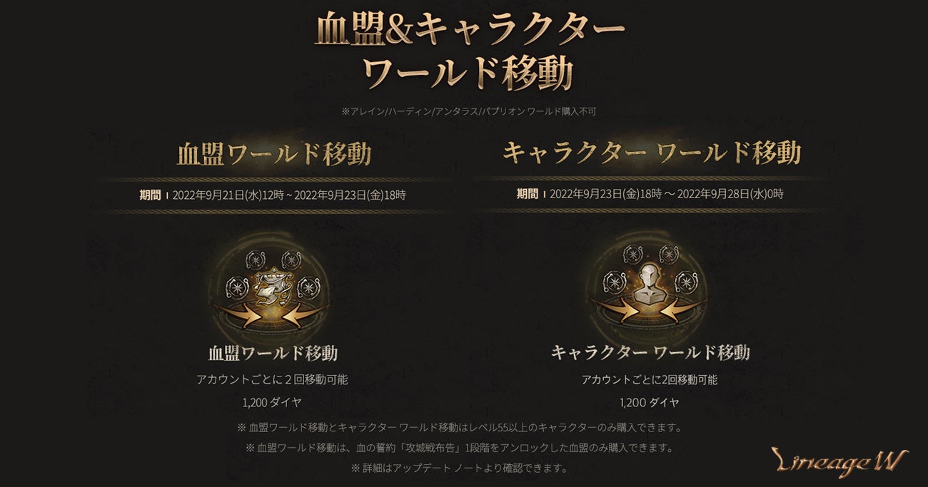 今回の「血盟 ワールド移動」「キャラクター ワールド移動」では、ワールド間での移動はキャラクターレベル55以上が必要となるほか、1アカウントごとに2回まで移動が可能となっております。