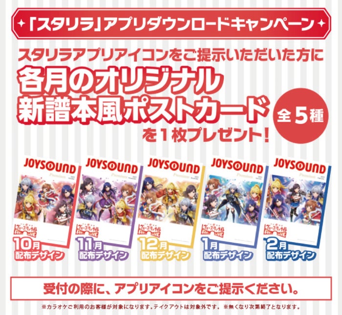 さらに、受付時に「少女☆歌劇 レヴュースタァライト -Re LIVE-」アプリアイコンをご提示いただいたお客様に、月毎にデザインが変わる、オリジナル新譜本風ポストカードをプレゼントいたします!