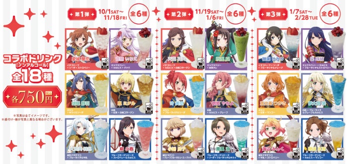 コラボドリンクには、「少女☆歌劇 レヴュースタァライト -Re LIVE-」のキャラクターをイメージした全18種(第一弾6種/第二弾6種/第三弾6種)【各750円(税込)】をご用意します。注文特典として、コラボドリンク1品ご注文につき、オリジナルポストカード(全32種:第一弾11種/第二弾10種/第三弾11種) の中からランダムで1枚プレゼントします。