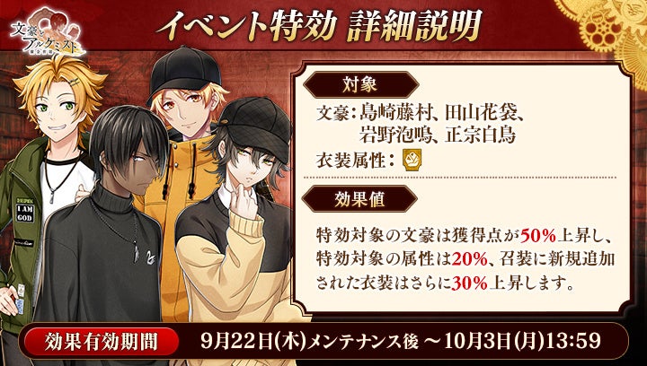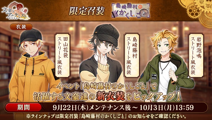 さらに、イベントと同時に開催される限定召装「島崎藤村のかくしごと」にて新規追加された「島崎藤村」「田山花袋」「岩野泡鳴」の〈ストリート風衣装〉を編成すると、得点の獲得率がそれぞれ30%上昇します。
