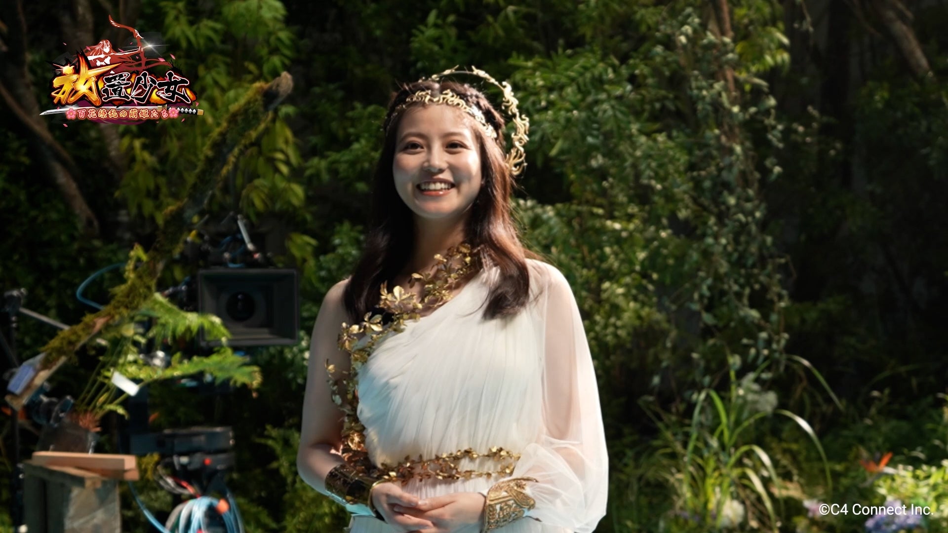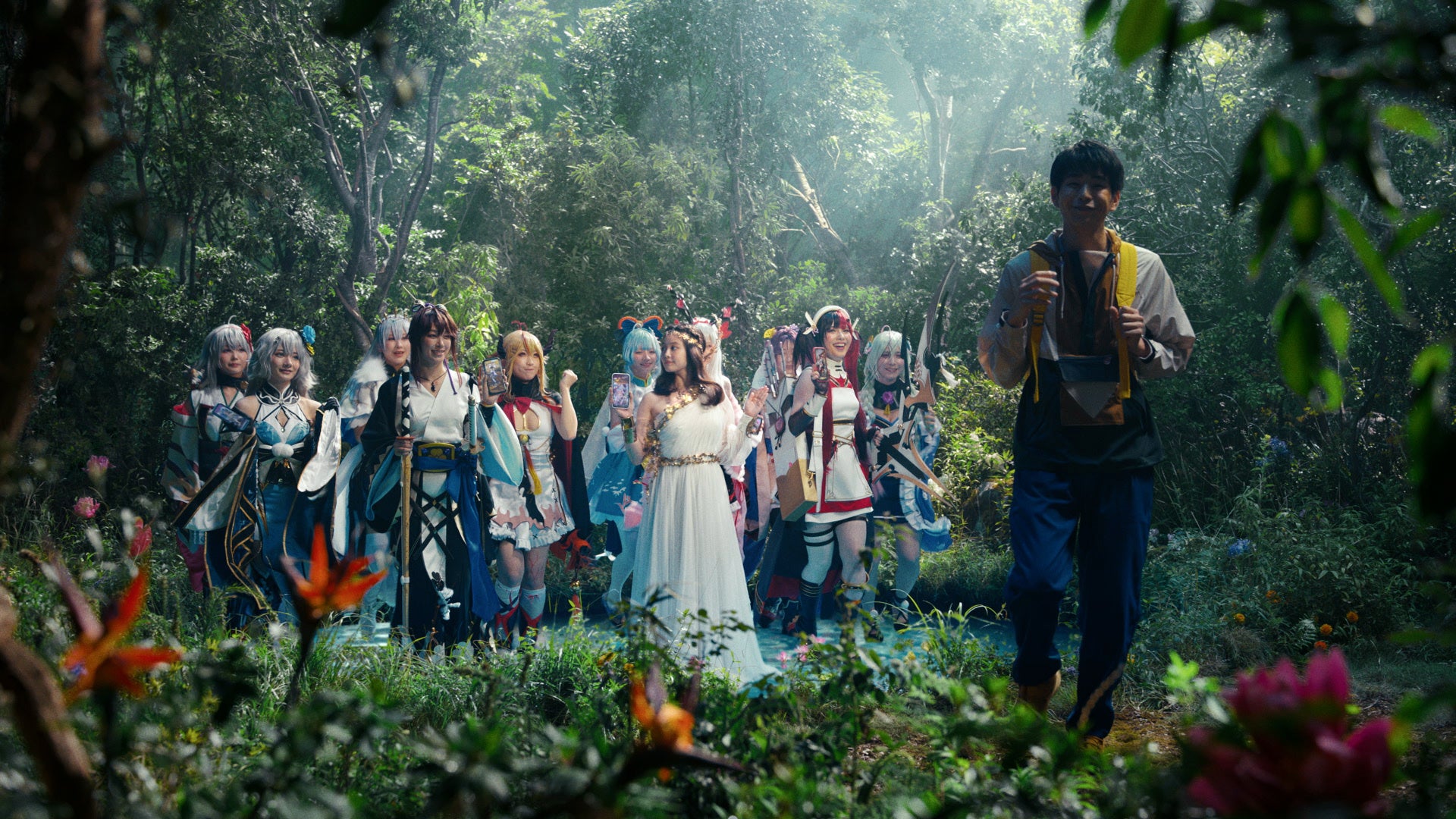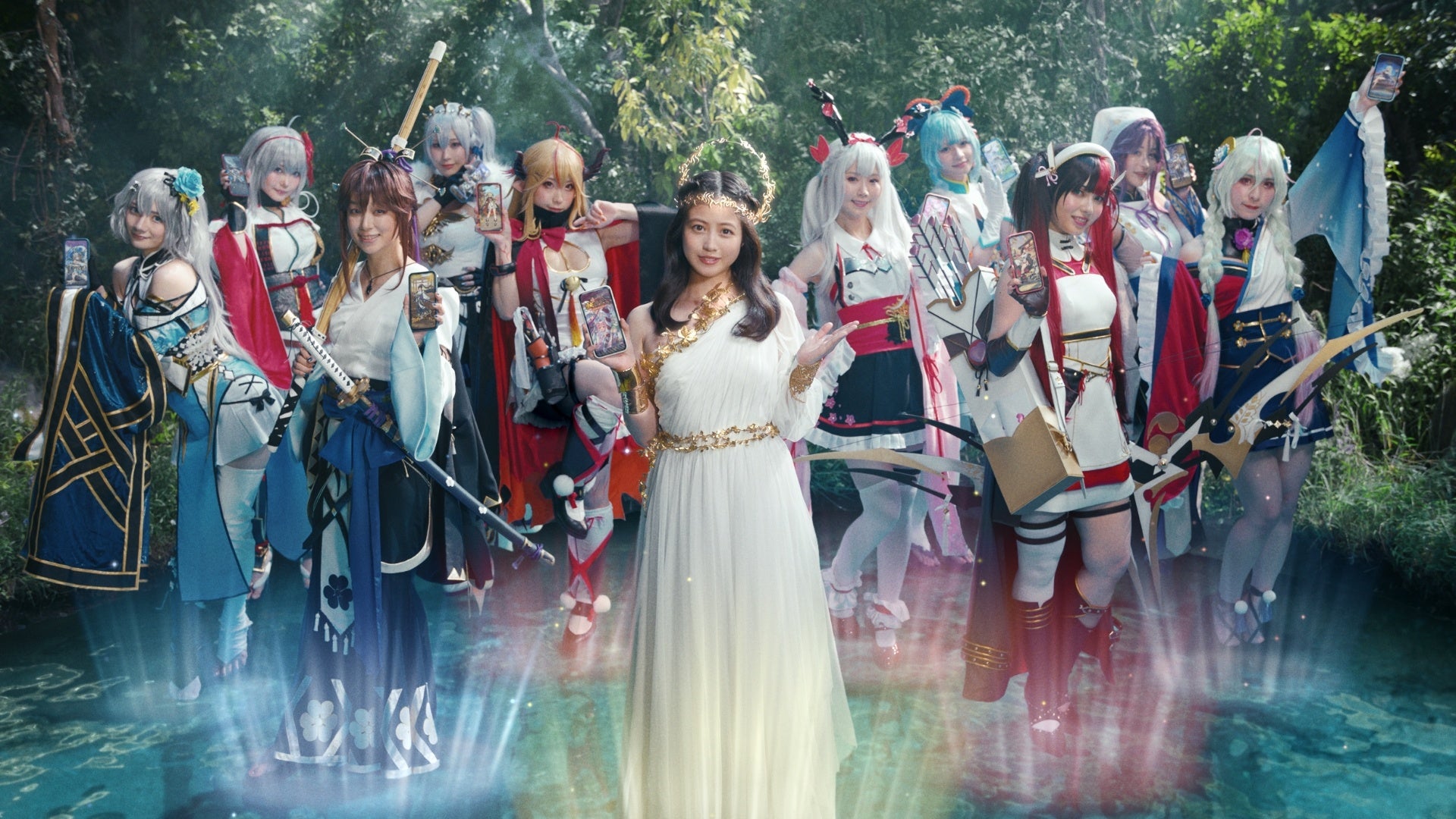 泉から登場する女神姿の今田さんを放置する青年を演じたのは俳優の中沢元紀さん。副将キャラクターがゲームから飛び出した姿で現れたことに感激したのでしょうか、数時間後に大量のスマートフォンを持ってもう一度泉の前にやって来ます。