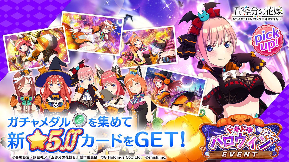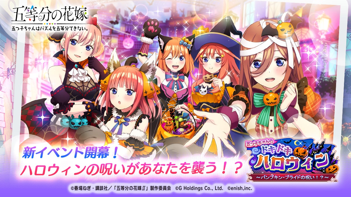 株式会社enish(本社:東京都港区、代表取締役社長:安徳 孝平、以下enish)は、2022年9月30日(金)より、アニメ「五等分の花嫁」初となるゲームアプリ『五等分の花嫁 五つ子ちゃんはパズルを五等分できない。』にて、週刊少年マガジン編集部完全監修のゲームオリジナルストーリーをフルボイスでお楽しみいただける新イベント「五つ子ちゃんのドキドキハロウィン~パンプキン・ブライドの呪い!?~」を開催いたします。