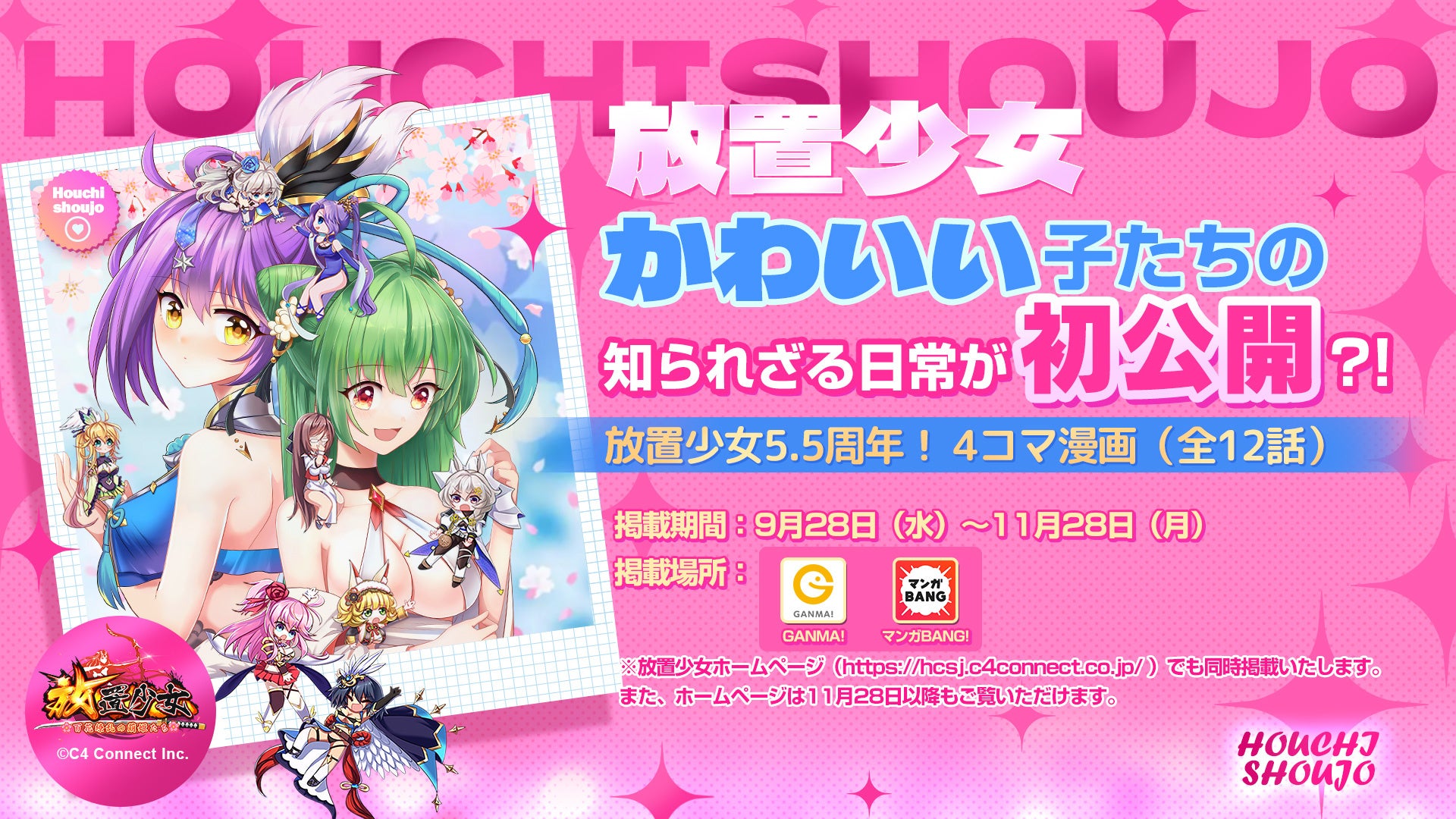 C4 Connect株式会社(本社:東京都新宿区)は、現在サービス中の美少女RPGゲーム『放置少女〜百花繚乱の萌姫たち~』(スマートフォンアプリ及びブラウザ版)(以下、『放置少女』)が5.5周年を記念して、9月28日(水)より『放置少女〜かわいい子たちの知られざる日常が初公開?!〜』(全12話/103ページ)がGANMA!・マンガBANG!・放置少女ホームページにて無料掲載開始することをお知らせいたします。