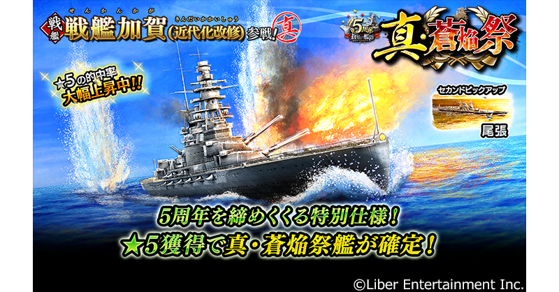 株式会社リベル・エンタテインメントは、男性向けオリジナルタイトル『蒼焔の艦隊』(そうえんのかんたい、iOS/Android/DMM Games)について、本日9月28日(水)より、新たに戦艦加賀(近代化改修)が参戦する真・蒼焔祭が開催されたことをお知らせいたします。