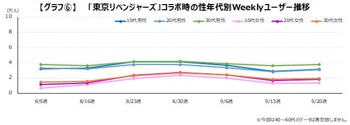 コラボ時のユーザーデモグラフィックの変化をみると、増加したのは主に女性層でした。8月9日週と比べると、8月30日週には20代女性は2倍以上、10代女性は3倍以上に増加しています。「東京リベンジャーズ」は、アニメ放映開始とともに女性の人気が非常に高まったこともあり、このコラボ施策で多くの女性ユーザーを獲得できたと推測されます。【グラフ⑥】
