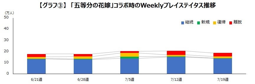 2021年7月5日から7月19日まで開催された「5等分の花嫁」コラボでは、先ほどの「鬼滅の刃」コラボほど多くの新規・復帰ユーザーを獲得はできませんでしたが、それでもイベント初週で新規・復帰を合わせて5万人程度のユーザーを獲得しています。【グラフ③】