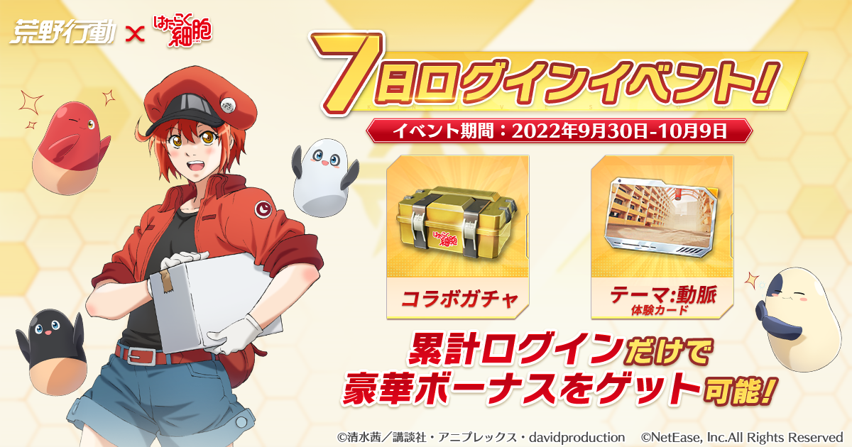 内容:イベント期間中、ゲームにログインするだけで1日に1度報酬を受け取れます。累計で7日間ログインすると、コラボガチャなどがゲットできます。
