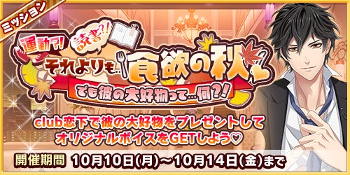 2022年10月10日(月)~14日(金)の5日間限定!club恋下に貴女の愛するキャラの大好物をプレゼントしに行こう♪なんと大好物をプレゼントするとキャラからのお礼ボイスが届く?!ぜひぜひ、大好きな彼に会いにclub恋下に遊びに来てね☆