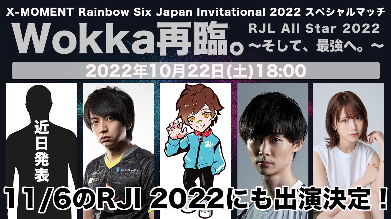株式会社NTTドコモ(以下、ドコモ)が主催する、『レインボーシックス シージ』国内トップリーグ「X-MOMENT Rainbow Six Japan League 2022(以下、RJL 2022)」は、「X-MOMENT Rainbow Six Japan Invitational 2022(以下、RJI 2022)」の開催を記念し、本年10月22日(土)18時よりスペシャルマッチ『RJL All Star 2022 ~Wokka再臨。そして、最強へ~』を開催することを決定いたしました。
