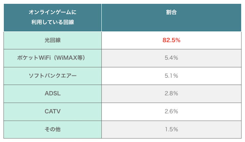 - オンラインゲームに利用されている回線は82.5%で光回線が最も多い