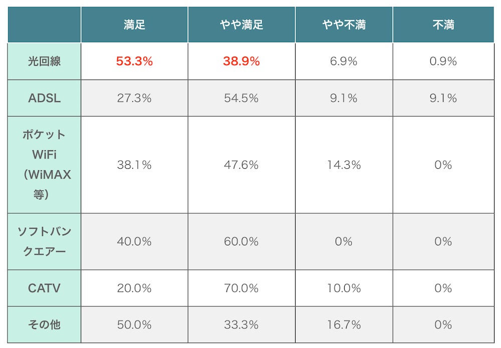 全回線の満足度は軒並み高い傾向にありますが、光回線と比べるとその他の回線はサンプル数が少ないことは留意すべきです。