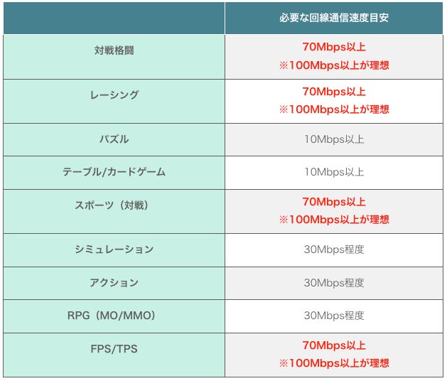 前提知識として、オンラインゲームではジャンル毎に次のような回線速度が必要となります。