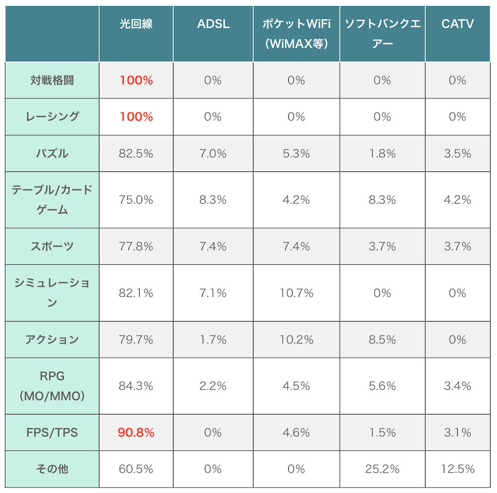 対戦格闘、レーシング、FPS/TPSといった回線速度が特に求められるオンラインゲームは光回線を利用している傾向が高いことが分かります。