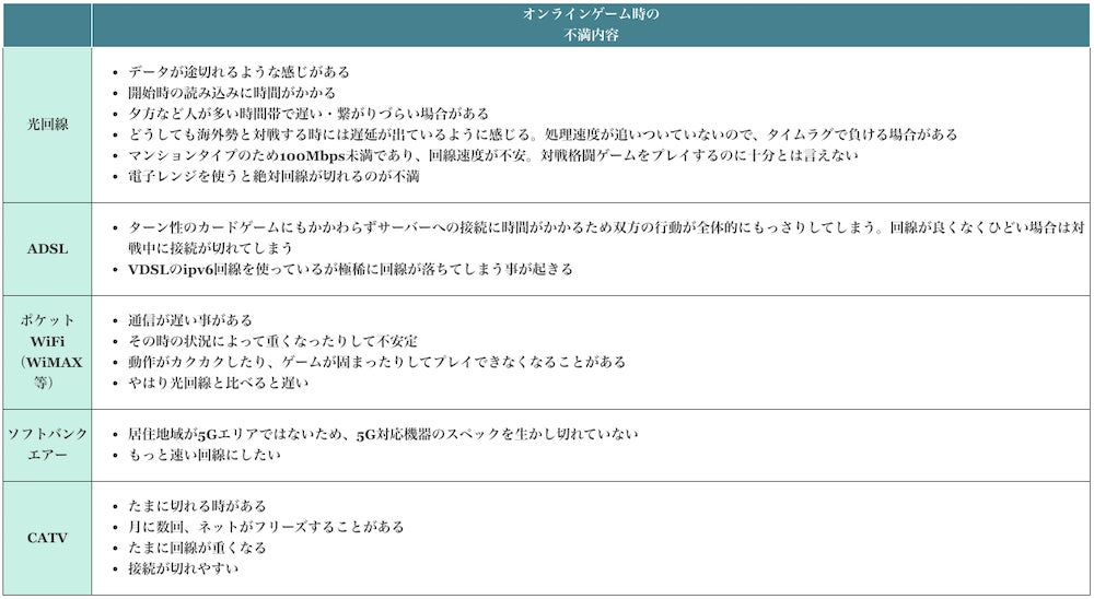 回線別にオンラインゲーム時の具体的な不満を調査したところ、次の結果となりました。