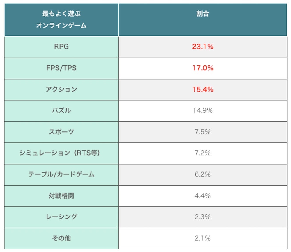 オンラインゲームの中で最もよく遊ばれるジャンルはRPG(23.1%)という結果となり、FPS/TPSが17.0%、アクションが15.4%と続きます。