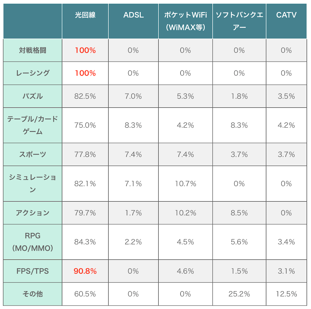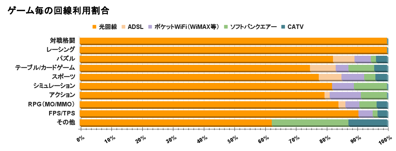 対戦格闘、レーシング、FPS/TPSといった回線速度が特に求められるオンラインゲームは光回線を利用している傾向が高いことが分かります。