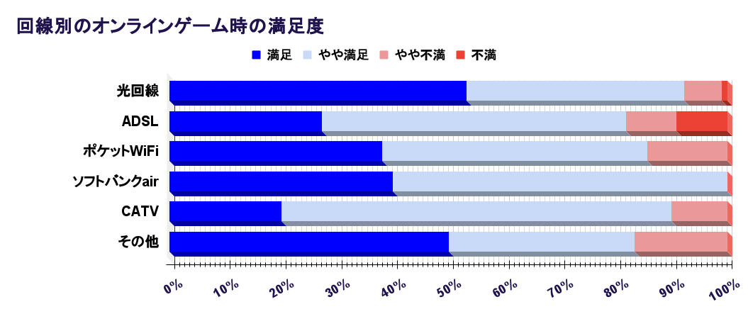 回線別にオンラインゲーム時の満足度を調査したところ、次の結果となりました。