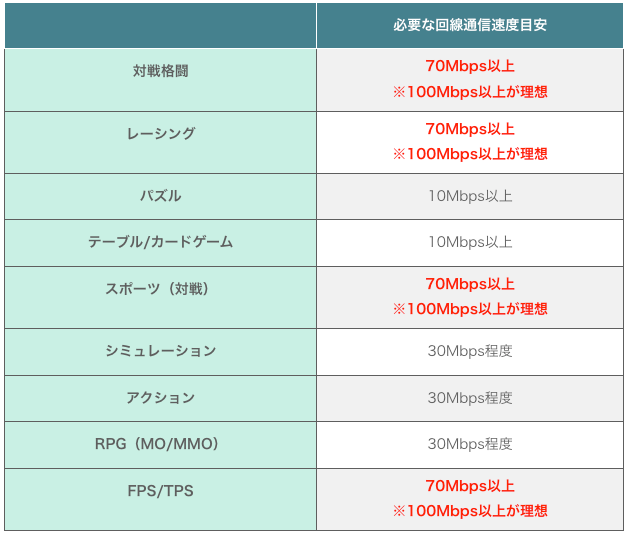 前提知識として、オンラインゲームではジャンル毎に次のような回線速度が必要となります。