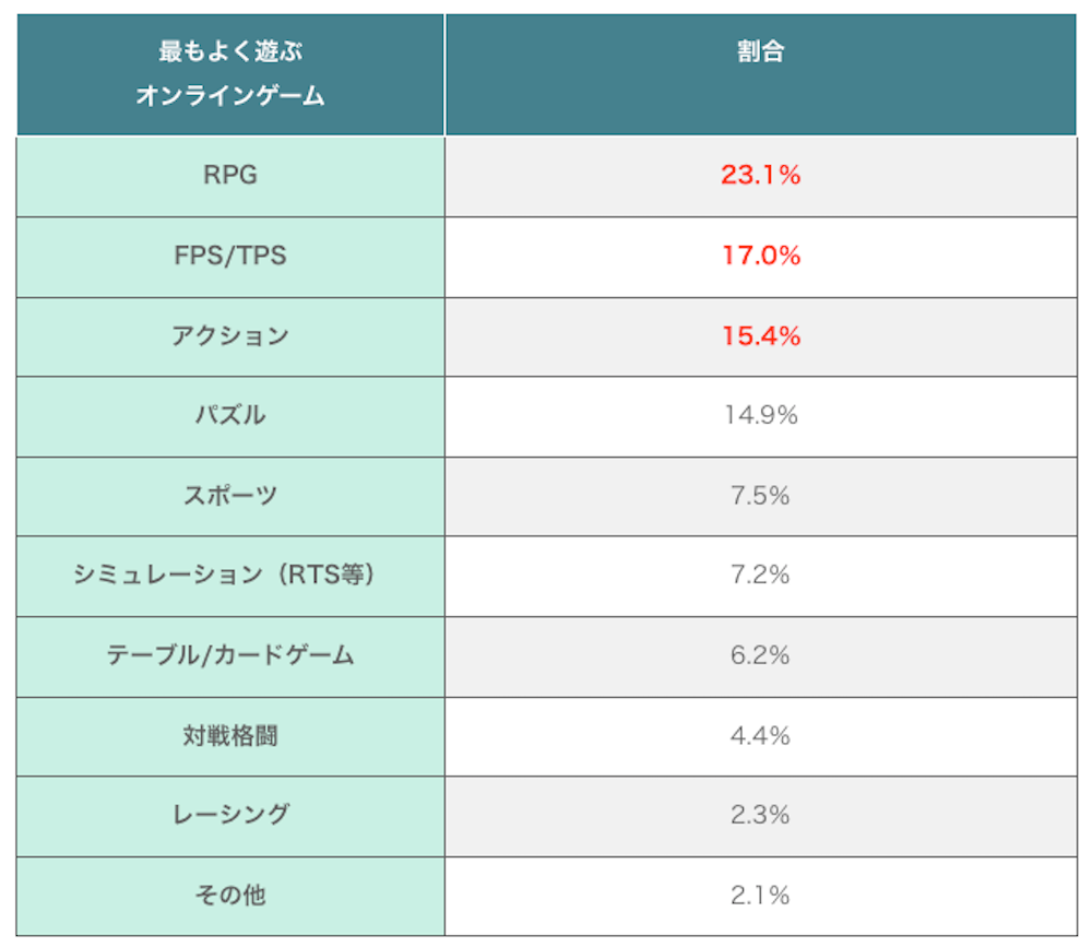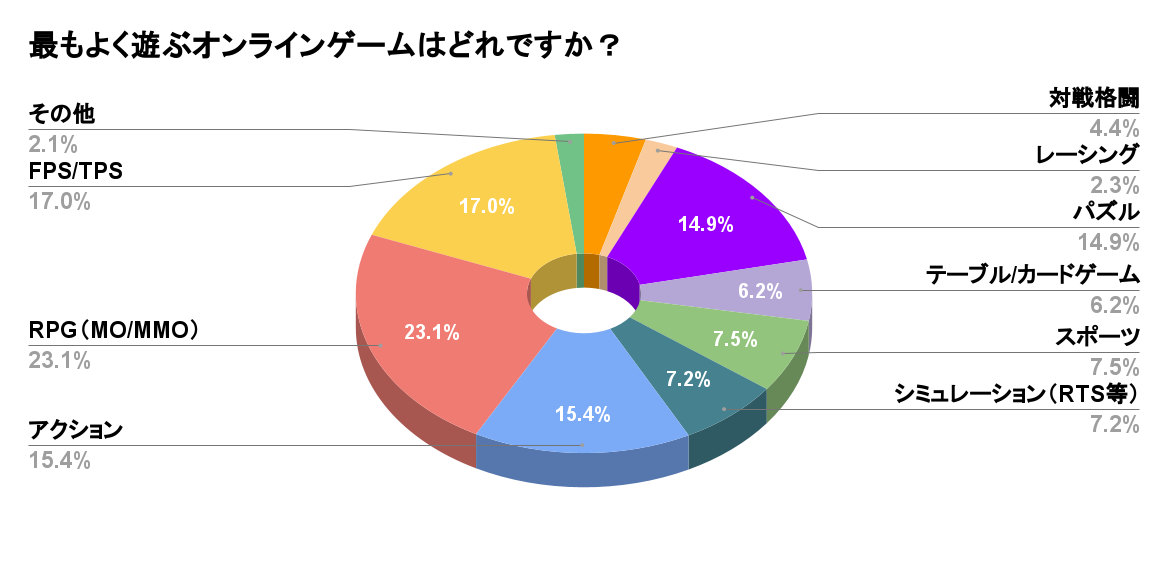 オンラインゲームの中で最もよく遊ばれるジャンルはRPG(23.1%)という結果となり、FPS/TPSが17.0%、アクションが15.4%と続きます。
