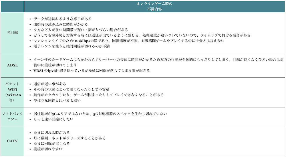 回線別にオンラインゲーム時の具体的な不満を調査したところ、次の結果となりました。