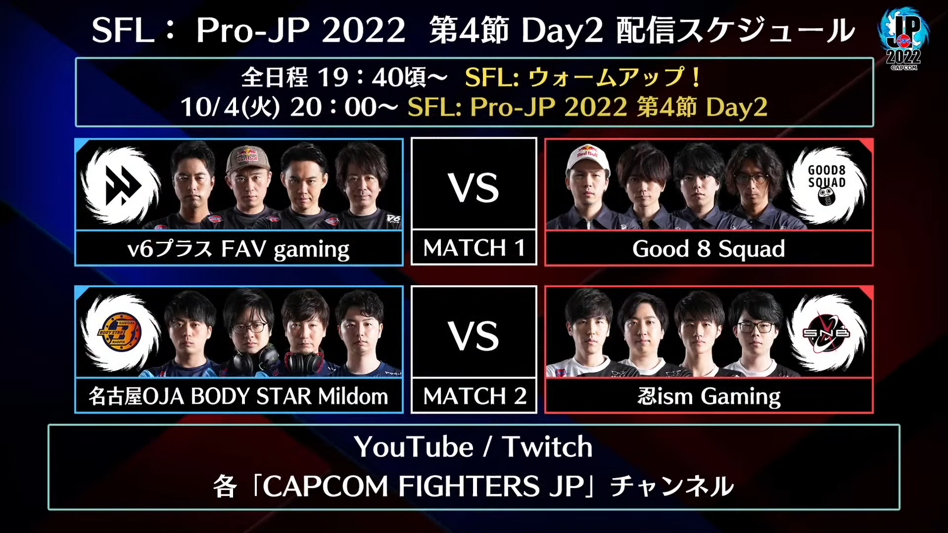 「ストリートファイターリーグ: Pro-JP 2022」第4節Day2は、10月4日(火)20時から「CAPCOM Fighters JP」の公式YouTube、Twitchチャンネルにて配信します。