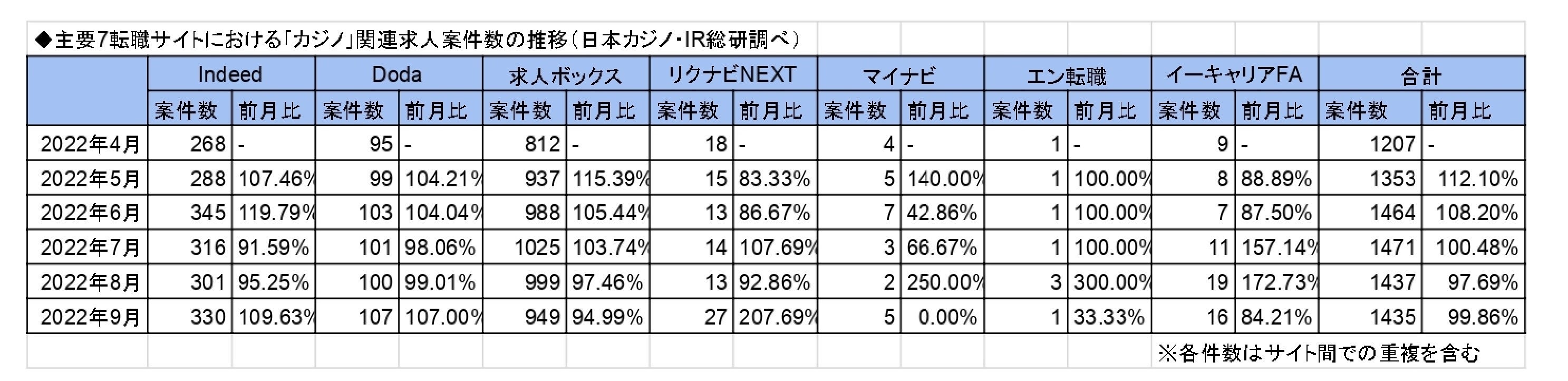 主要転職7サイト別の数値としては、「Indeed」が330件、「doda」が107件、「求人ボックス」が949件、「リクナビNEXT」が27件、「マイナビ転職」が5件、「エン転職」が1件、「イーキャリアFA」が16件となりました。2022年8月の1437件よりも2件減少しました。